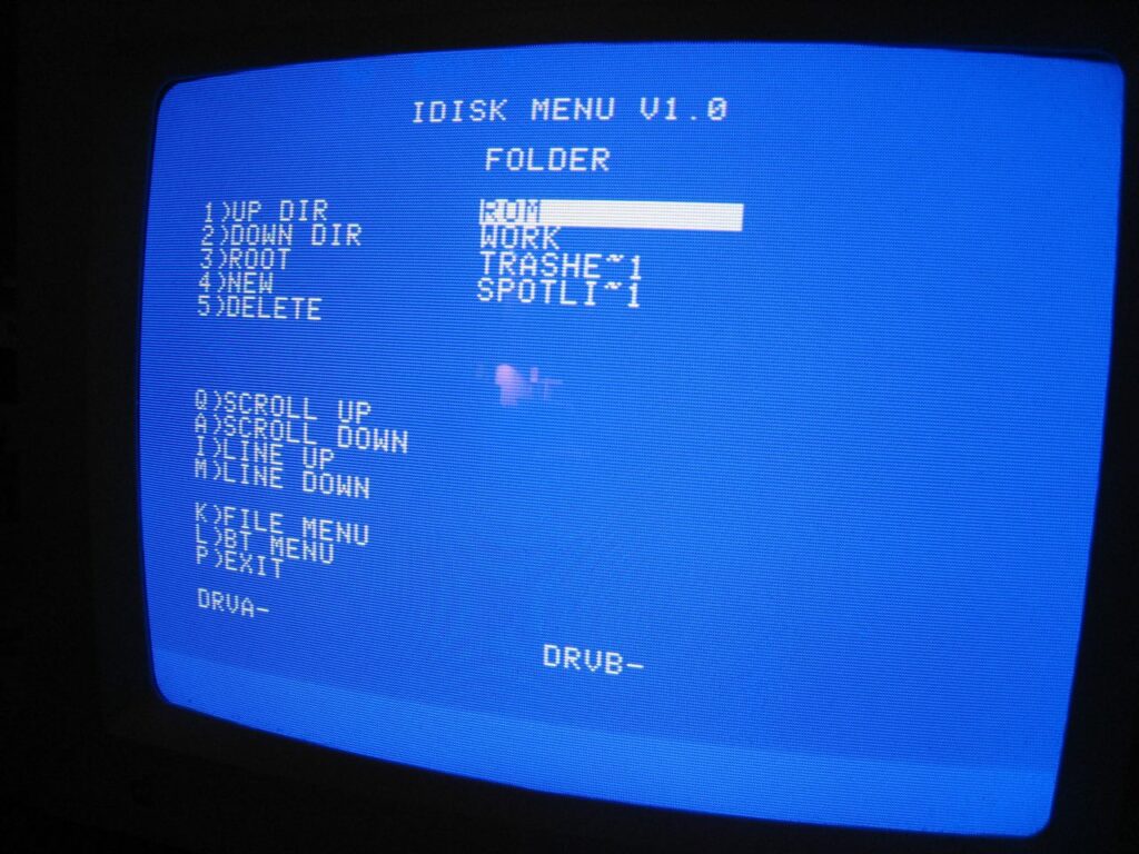 Press the reset button, turn your computer on and release the button, the iDisk menu is displayed and allows you to browse through your .DSK disk images or access the Bluetooth features which have not been tested yet. The menu is simple but lacks simplicity as key shortcuts are not user-friendly (P to exit, 2 to enter a folder, and so on) I would like to see a firmware update to correct these minor issues.