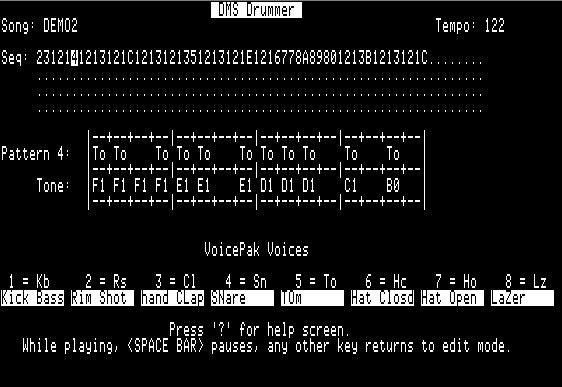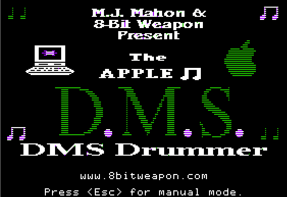 Introducing the amazing DMS Drummer for Apple II personal computers! The DMS Drummer is the only wavetable based Drum Sequencer for the Apple //e, IIc, IIc+, and IIGS computers. It comes complete with 8 drum sounds: Bass, Snare, Rim Shot, Hand Clap, Tom, Hat Open, Hat Closed, and Lazer. DMS Drummer also has a massive sequencer built-in for song writing or just some creative noodling. The DMS Drummer monophonic sequencer patterns have 16 spaces. You can create up to 16 unique drum patterns and arrange them into 256 available arrangement slots. Each drum sound can also be re-pitched or “tuned” to the users preference inside the “Tone” section of any pattern. For example, you can take the single tom sound and create a rich sequence of multiple toms in various pitches like in our demo song. Each song sequence can be saved on disk as well for safe keeping. All commands/instructions can be found from the “help” page built-in to the software by pressing “?”.