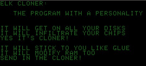The boot sector virus was written for Apple II systems, the dominant home computers of the time, and infected floppy discs. If an Apple II booted from an infected floppy disk, Elk Cloner became resident in the computer’s memory. Uninfected discs inserted into the same computer were given a dose of the malware just as soon as a user keyed in the command CATALOG for a list of files. Infected computers would display a short poem, also written by Skrenta, on every fiftieth boot from an infected disk: