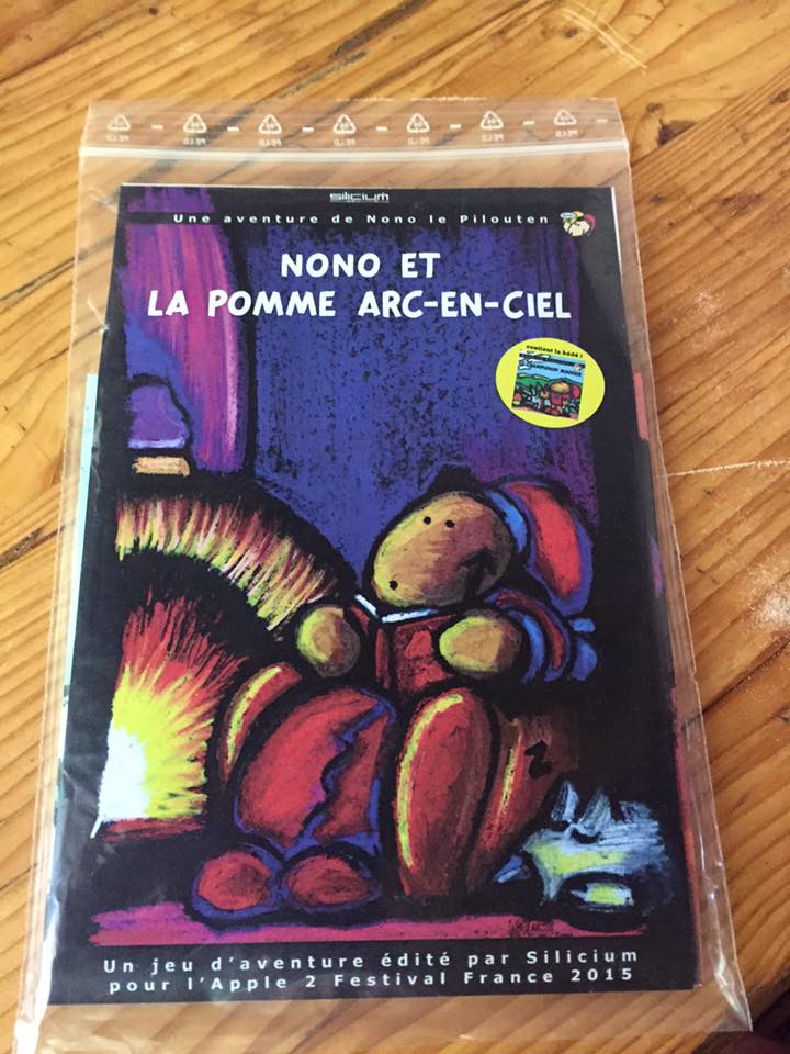 Antoine Vignau reports a new game was released during Apple II Festival France 2015. I don’t speak or read French very well, but it appears to be an adventure game written by Benoit Triquet and Renรฉ Speranza. The game is entitled “Nono et la pomme arc-en-ciel” or (apologies if I get this wrong) “Nono and the Rainbow Apple”.