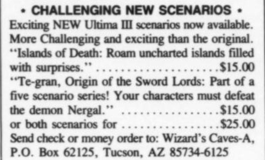 The fan-made scenarios mentioned in this post, Islands of Death and Te-gran: Origin of the Sword Lords, were advertised in Nibble magazine Volume 6 Issue 4 (April 1985), as shared on Facebook.