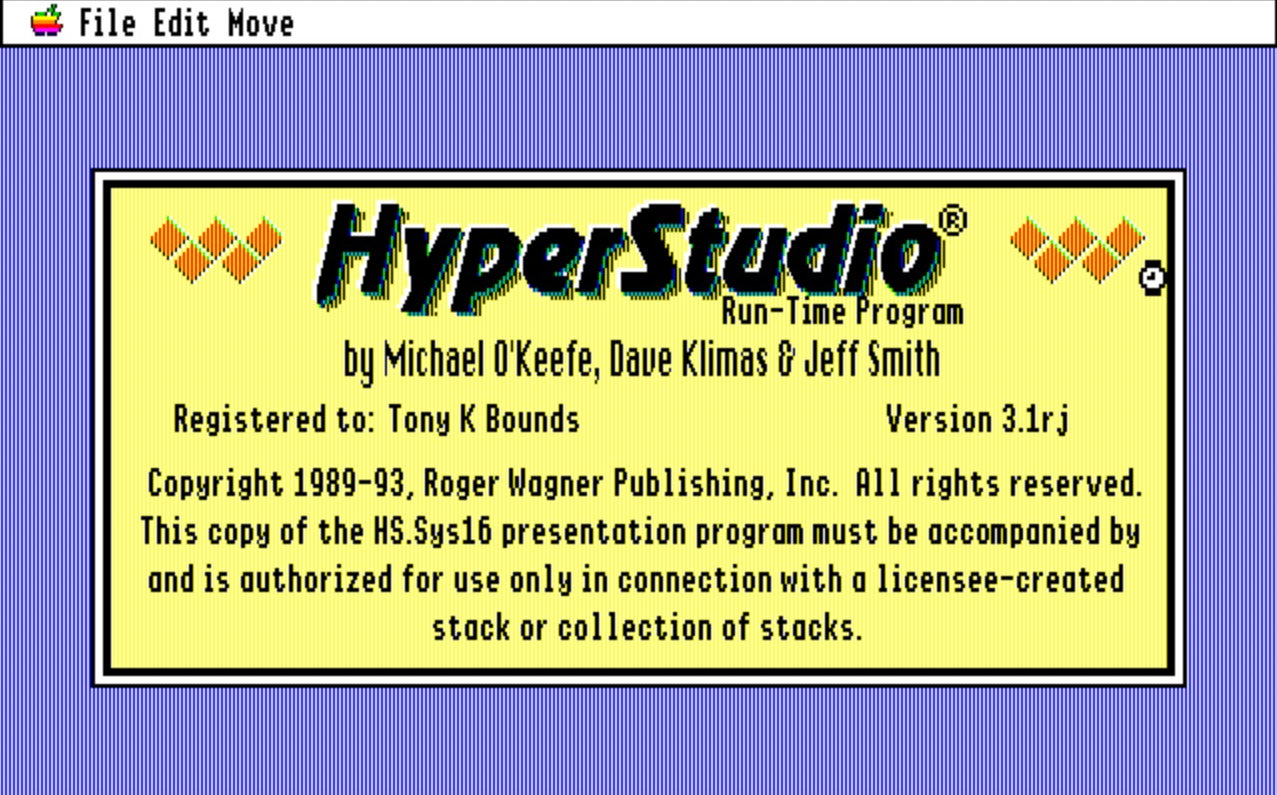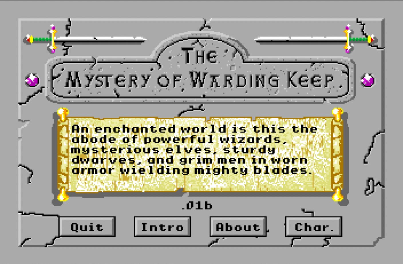 Picchi has made two 800K .PO disk images of the role-playing game available for download from the Internet Archive. When mounted, the volume names are prefixed with MWK — short for The Mystery of Warding Keep. The game is built in HyperStudio, but a standalone copy of HyperStudio is not needed to launch the stack. It is unknown at this time if this is the most recent version of the game, or if Bounds developed it further.